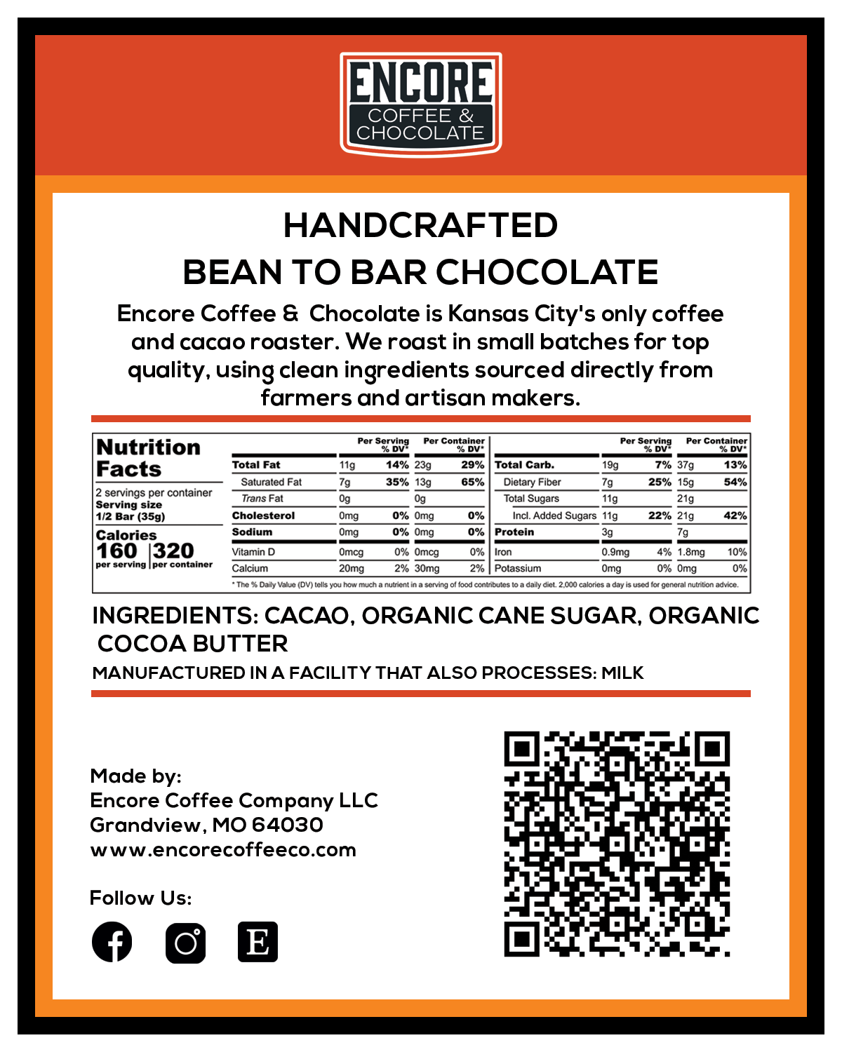 Ingredients: Organic Cacao, Organic Cane Sugar, Organic Cocoa Butter